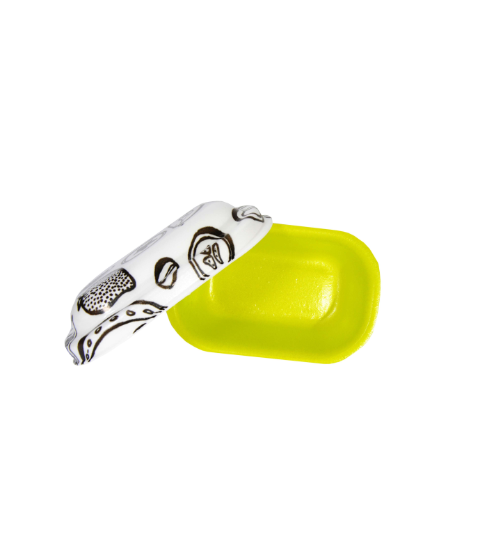 Coperchio di chiusura: fondo bianco con raffigurazioni stampo nero di frutti tropicali